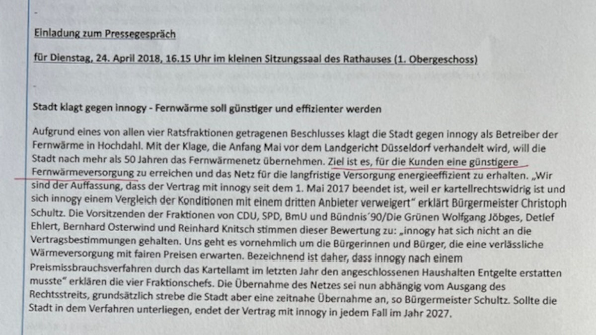 Da innogy sich gegen die Kündigung wehrte kam es zu einem Gerichtsverfahren. Aus einer Pressekonferenz dazu wird Bürgermeister Schultz zitiert: "Wir als Stadt Erkrath glauben, dass wir die Hochdahler Haushalte deutlich kostengünstiger und effizienter mit Wärme versorgen können." (Rheinische Post 26.04.2018: "Stadt klagt gegen Fernwärme-Anbieter".)